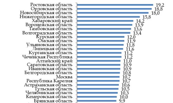 Согласно исследованию, столь же позитивно настроены в экономическом плане жители Орловской (индекс 18,8) и Новосибирской (индекс 18) областей. Также в пятёрку регионов с самым высоким индексом вошли Нижегородская область и Хабаровский край.